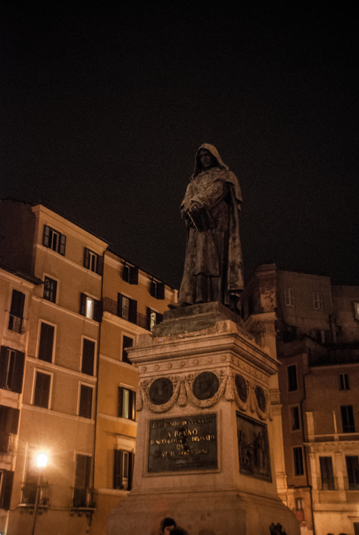 Campo dei Fiori nocą nie prezentuje się tak okazale jak za dnia, ale i tak nie rozczarowało nas pod kulinarnym kątem. Na środku placu znajduje się pomnik Giordana Bruno, niegdysiejszego zakonnika, filozofa i astronoma, który za rzekome głoszenie herezji został spalony dokładnie w tym miejscu. Przez kolejne 100 lat wykonywano tu wyroki śmierci, aby na przełomie XV/XVI wieku... plac stał się ośrodkiem życia kulturalnego. Pokazy wędrownych artystów i targi ściągały wiele, wiedzionych ciekawością, osób.
