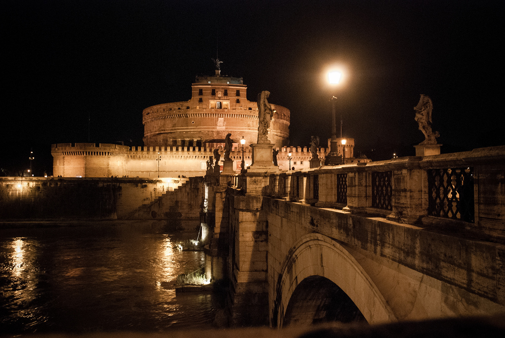 Gdy skończyliśmy się zachwycać nocnym obliczem Watykanu, poczuliśmy jak bardzo doskwiera nam głód. Wyruszyliśmy w kierunku Campo dei Fiori - miejsca o dużym skupieniu kanapek przypadających na jeden metr kwadratowy. Wracając z lub do hostelu za każdym razem mijaliśmy Ponte Sant'Angelo z widokiem na dawne mauzoleum Hadriana, którego obecna nazwa - Castel Sant'Angelo - pochodzi od stojącego na szczycie anioła.